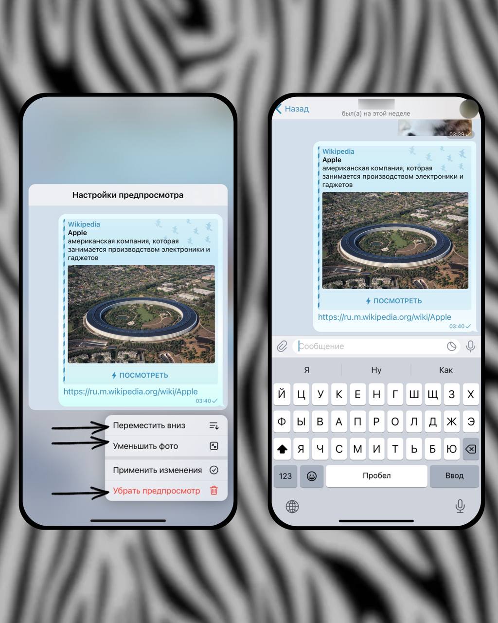 1️⃣ Вставьте ссылку в строку ввода сообщения. Как только превью загрузится, оно станет активным для редактирования.