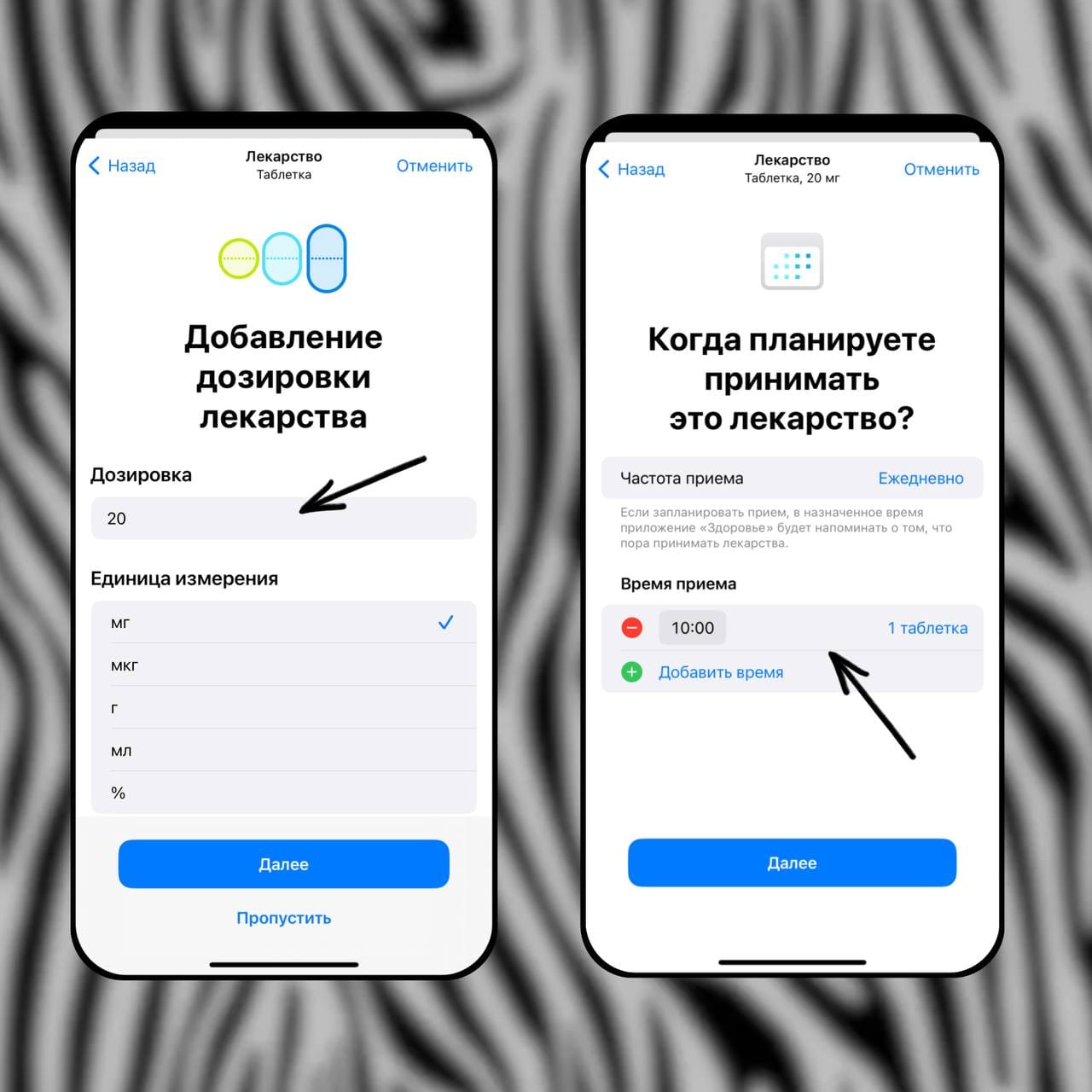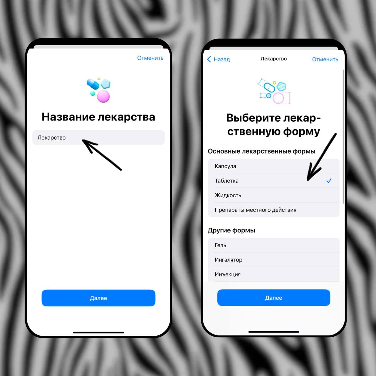 4️⃣ Нажмите на «Добавить лекарство» и введите необходимые данные: форму, дозировку, время и частоту приема✔️
