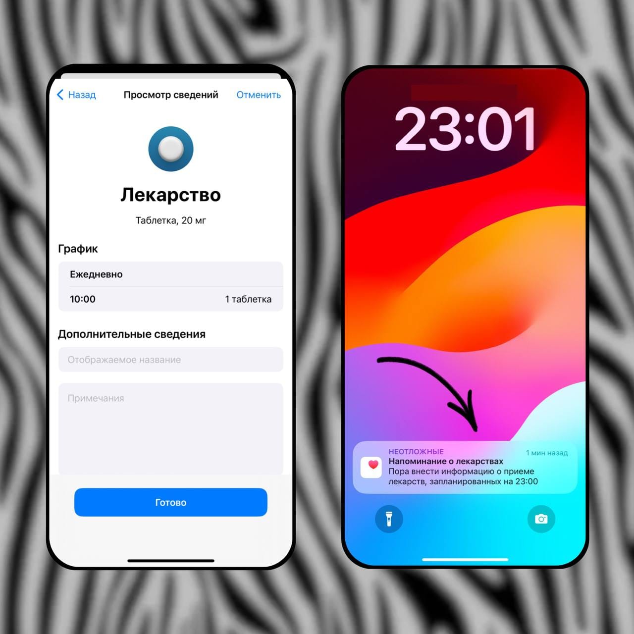 Теперь, в указанное время, вы будете получать уведомления с просьбой внести сведения о принятии лекарства. Простое решение для вашей заботы о здоровье🙌🏼