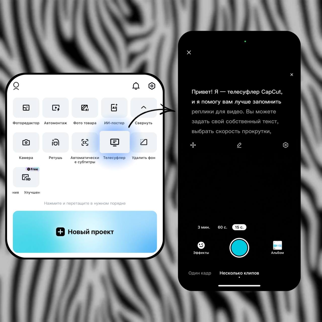 В главном меню CapCut, прямо над проектами, вы можете найти такой инструмент как телесуфлер. Он позволяет вам вводить текст, который будет прокручиваться на экране во время записи. Вы можете настроить скорость прокрутки, размер и цвет шрифта, а также разместить окно телесуфлера там, где вам удобно. Это идеальный инструмент для запоминания реплик и экономии ваших времени и сил.