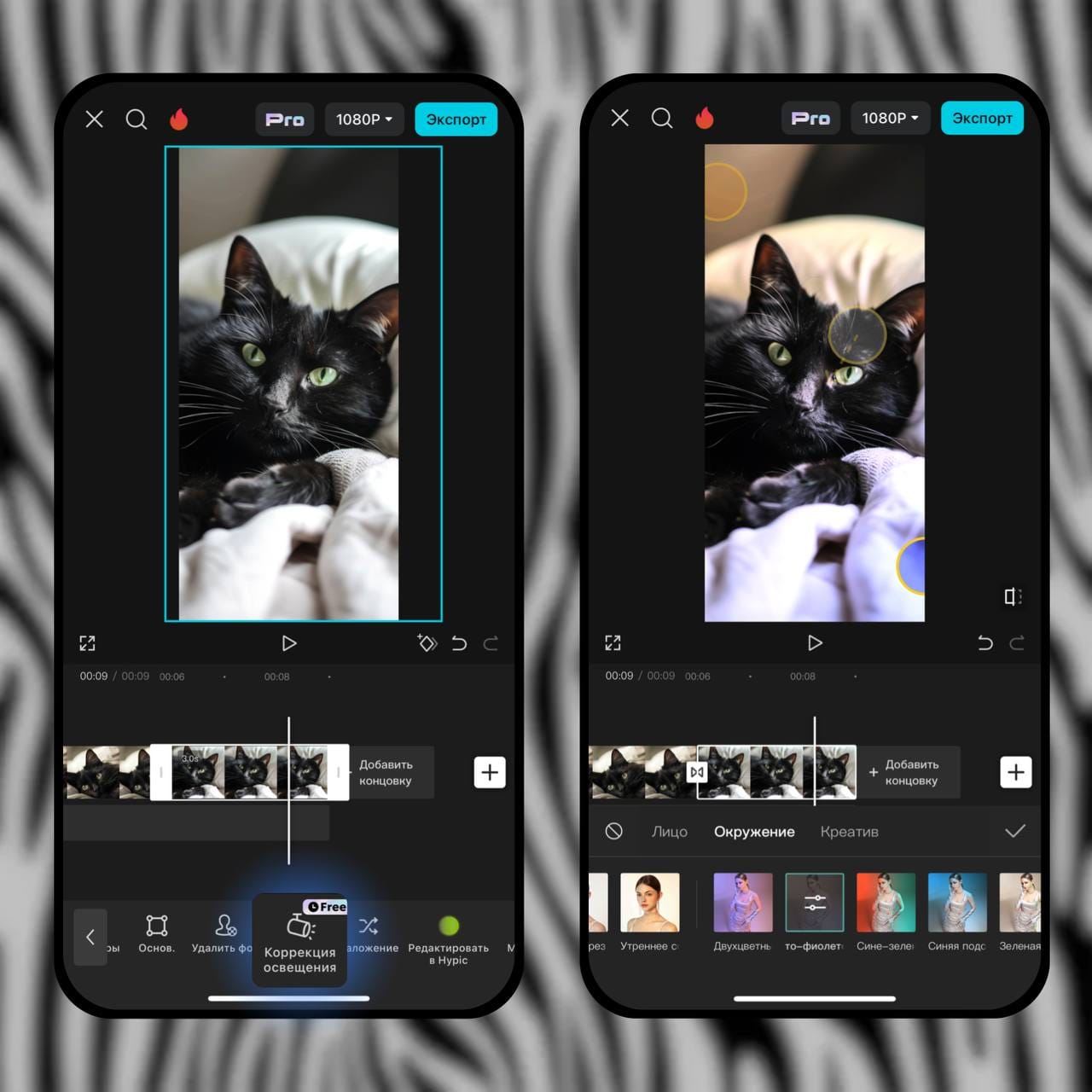 Хотите добавить света или изменить фон в вашем видео? В CapCut есть возможность корректировать освещение: выделяем дорожку с видео ➜ находим функцию Коррекция освещения.