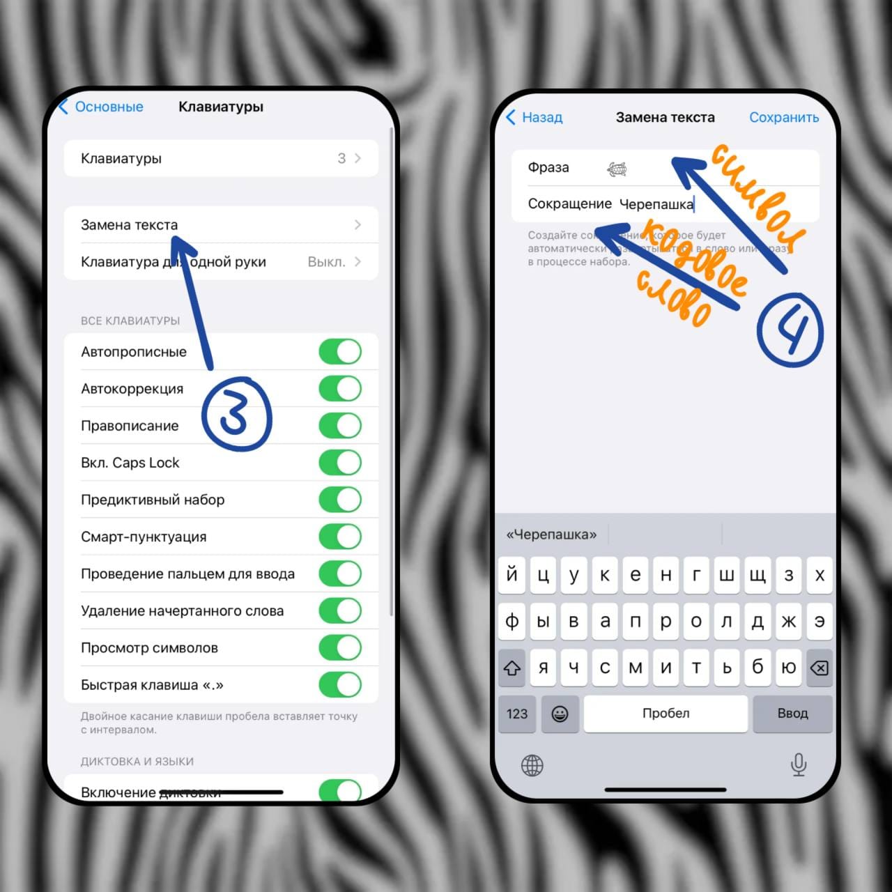 Заходим в Настройки ➜ Основные ➜ Клавиатура ➜ Замена текста ➜ Нажимаем на "➕" ➜ в «Фразу» вставляем символ ➜ в «Сокращение» пишем кодовое слово. Готово✔️