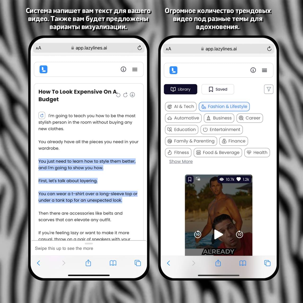 ✦ Персонализация: настройте видеоролики под свой уникальный стиль и голос бренда. LazyLines предлагает инструменты, которые делают ваш контент действительно вашим.