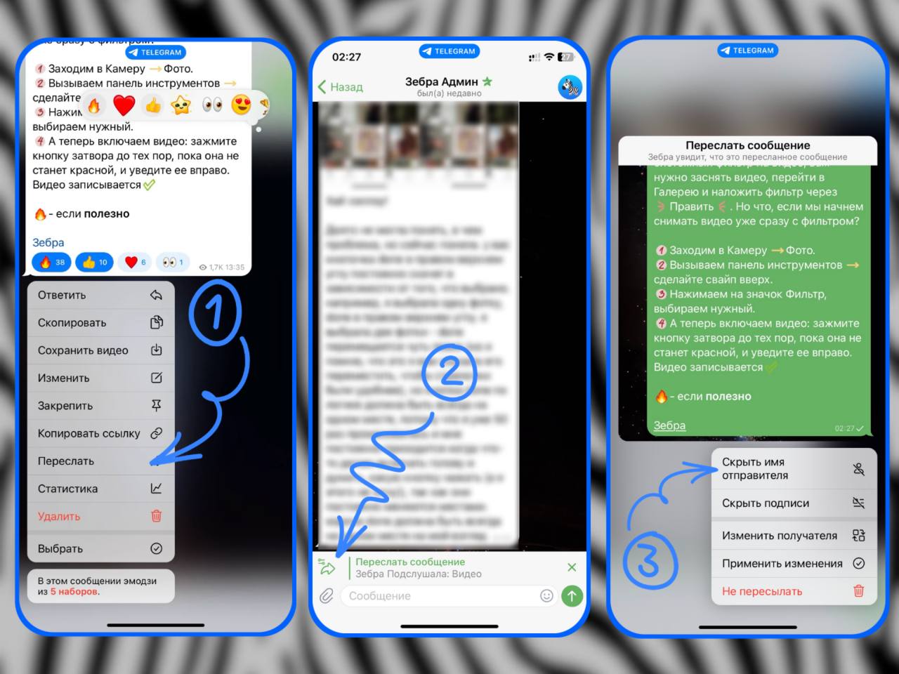 1️⃣ Выбираем нужное сообщение, зажимаем и выбираем «Переслать».